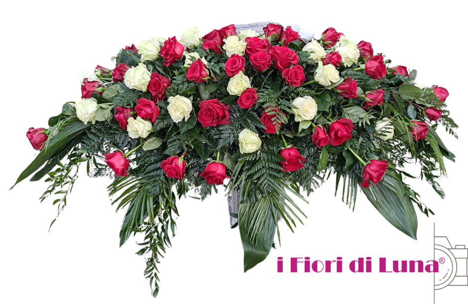 La composizione può essere realizzata interamente con rose rosse oppure con un elegante abbinamento di rose rosse e rose bianche, dove il bianco richiama purezza, pace e ricordo eterno. Il tutto è armoniosamente completato da verde ornamentale naturale (felci, fogliame decorativo ed eucalipto), che dona profondità, equilibrio e raffinatezza all’insieme.
