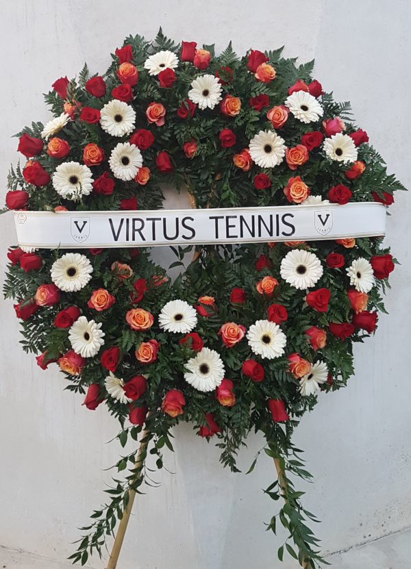 Corona di fiori funebre colorata, diametro 100 cm., realizzato in occasione dell’ultimo saluto al caro estinto, personalizzato in accordo con i famigliari.